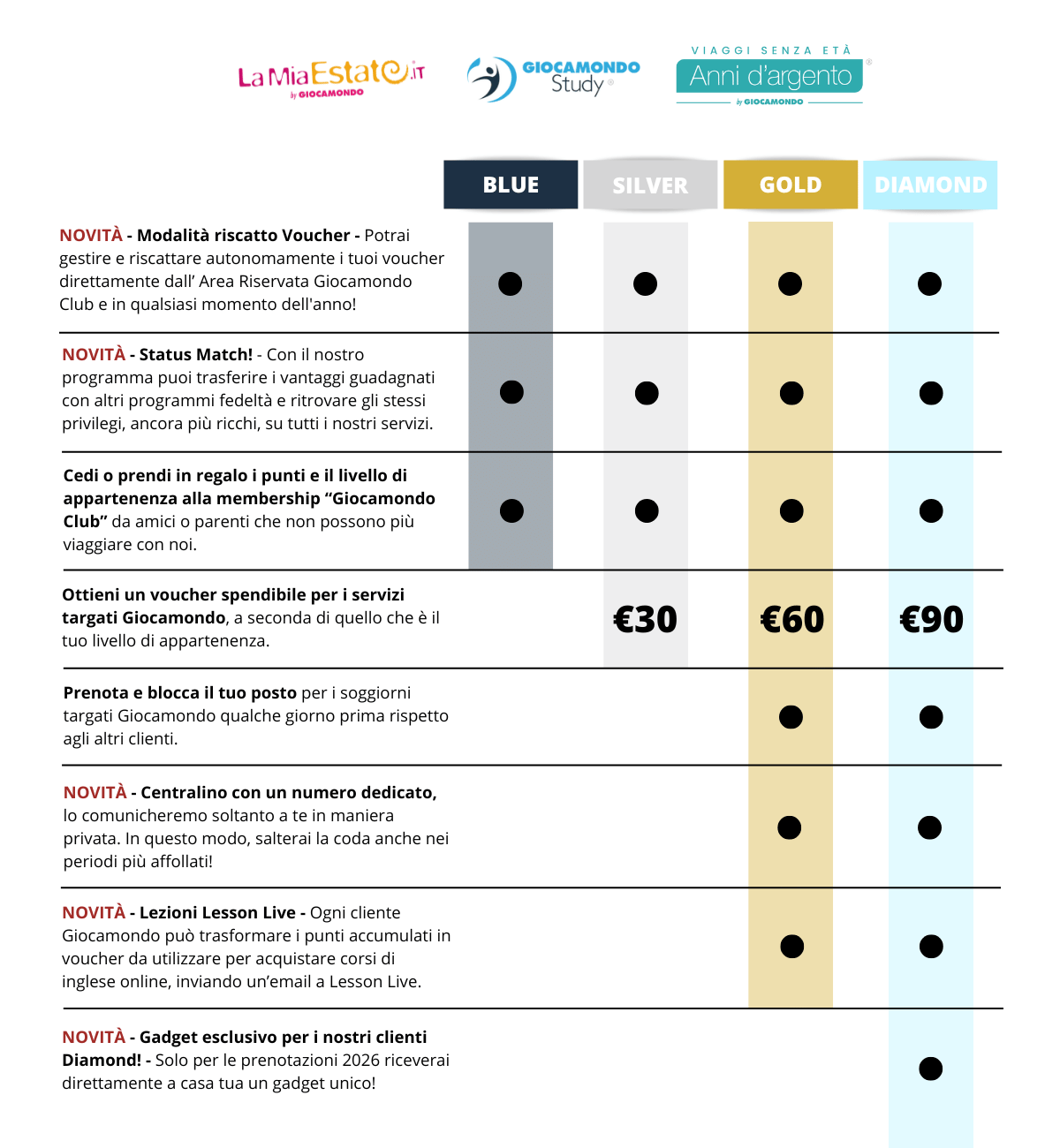 I livelli di appartenenza al Giocamondo Club sono assegnanti in base alle prenotazioni effettuate negli anni con la Giocamondo. Ad esempio, se siete partiti con noi per 3 anni consecutivi apparterete alla categoria Silver. Se avete scelto di partire con noi solo per 1 anno, apparterrete alla categoria Blue.